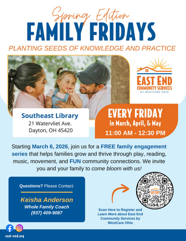Starting March 6, 2026 join us for a FREE family engagement series designed to strengthen blooming families through play, reading, song, dance, and community connection opportunities. We invite YOU and your family to come grow with us! Family Friday will take place every Friday in March, April, and May from 11:00am-12:30pm at Southeast Library 21 Watervliet Avenue Dayton OH 45420.
