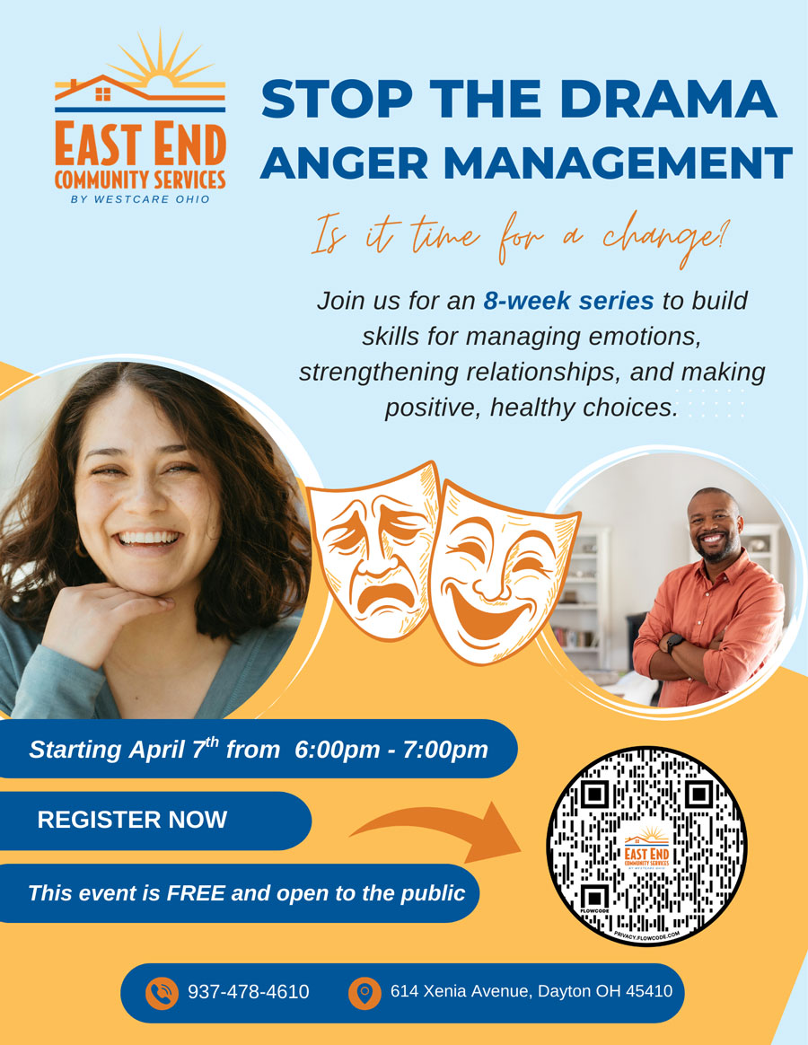 Join us for an 8-week series to build skills for managing emotions, strengthening relationships, and building skills for positive, healthy choices. Our Stop the Drama Anger Management series begins April 7th and runs every Tuesday night from 6-7pm. Please note this program series will be held at East End Community Services’ new Center for Health and Healing at 614 Xenia Avenue. Everyone is welcome. This program is FREE and open to the public.